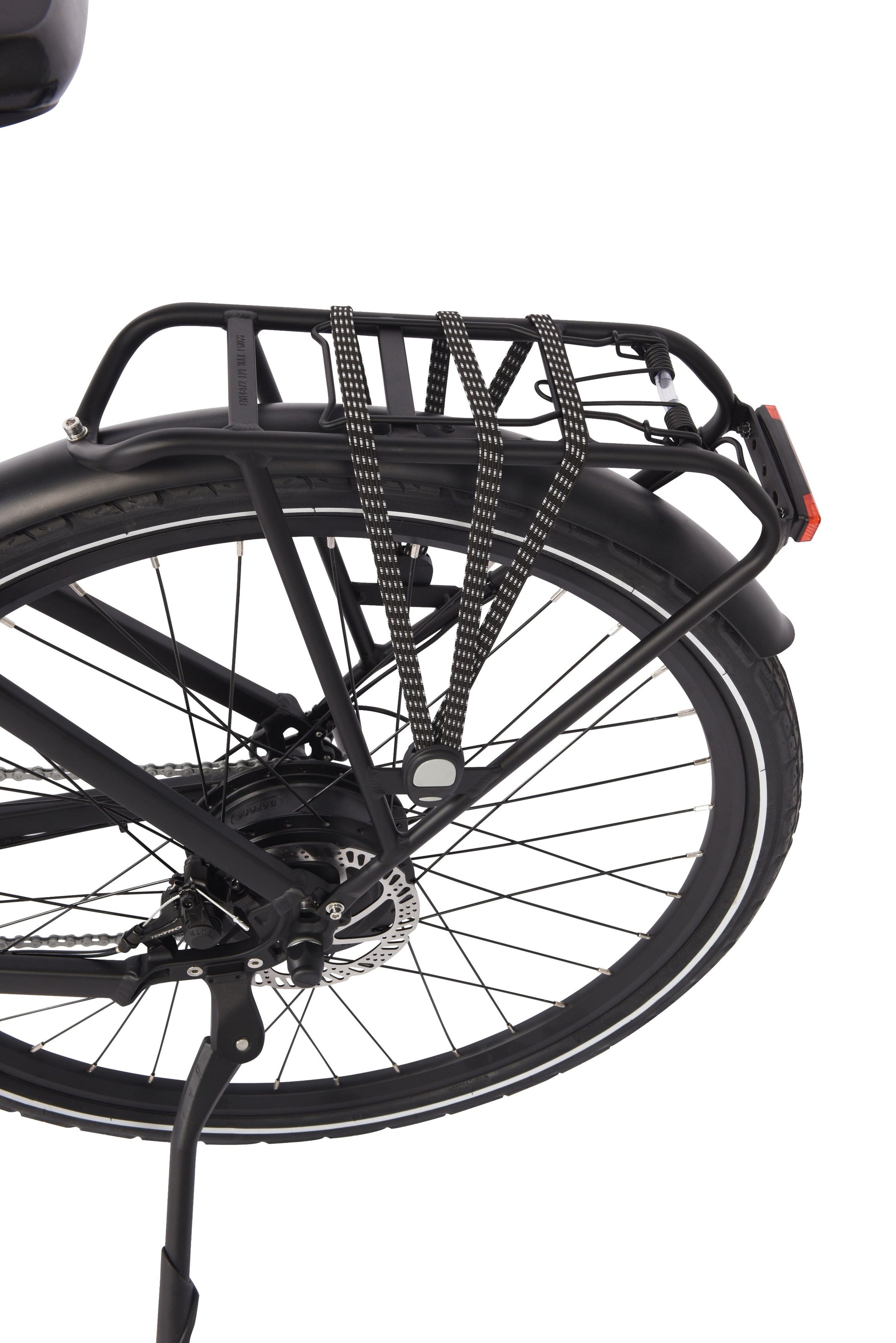 Equipped with a rear rack, full mudguards, chain guard, kickstand, and integrated lighting — ready for commuting straight out of the box.